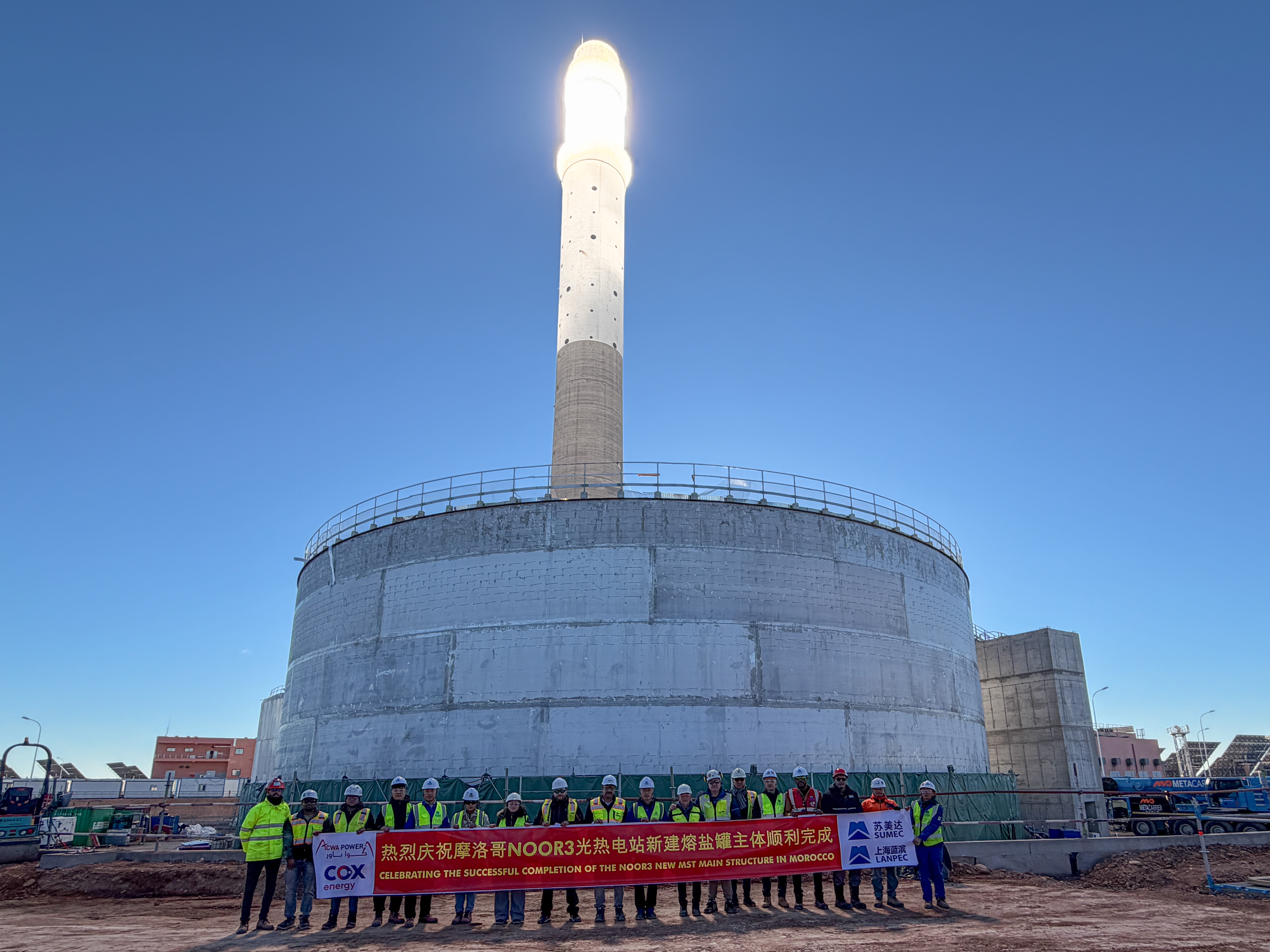 摩洛哥NOOR3光热电站热熔盐罐主体提前30天落罐。该项目是蓝科高新下属上海蓝滨首次直签海外施工合同,与苏美达能源协同执行,依托双方技术与海外运营优势,破解工作签、清关等难题,获业主ACWA集团致谢,成为中国光热储能技术走向国际的重要突破。